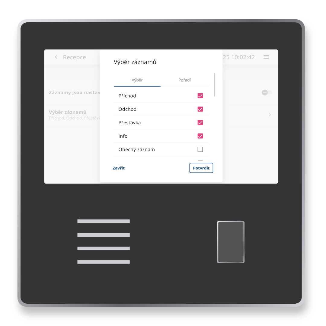 Karta Záznamy slouží k nastavení a výběru záznamů, které chcete na terminálu zaznamenat. V systému můžete mít nastaveno více záznamů pro záznam práce, ale na terminálu můžete nastavit pouze záznamy, které si vyberete.