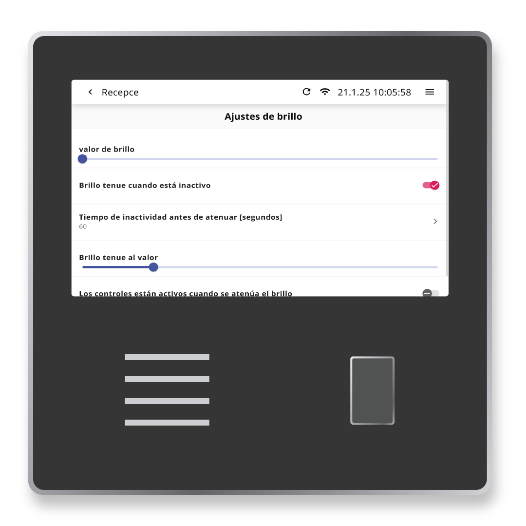 En este ajuste existe la posibilidad de fijar el brillo de la pantalla y también el límite en el que se atenúa el brillo durante la inactividad.