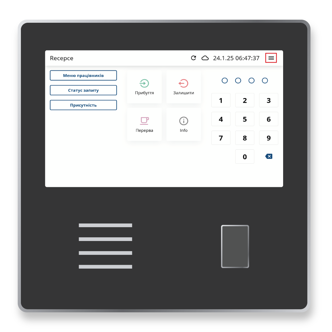 Змінитив меню RFID-ідентифікації.Прикладіть RFID-носій до зчитувача терміналу (4 горизонтальні лінії з лівого боку терміналу).