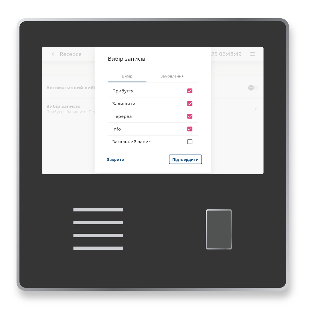 Вкладка Записи використовується для налаштування та вибору записів, які ви хочете записати на терміналі. Ви можете налаштувати більше одного запису в системі для запису вашої роботи, але ви можете налаштувати тільки ті записи, які ви вибрали на терміналі.